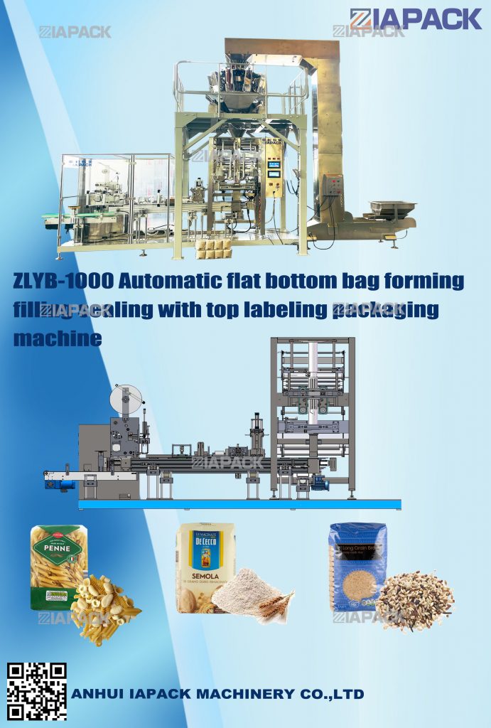 Ezt a gépet széles körben használják búzaliszt, gabonafélék, tészta lapos fenekű zacskóba, felső címkével történő csomagolására. Az egész rendszer, beleértve a termék adagológépet, a termékmérő gépet, a zacskóformázó töltőgépet és a lineáris típusú zacskó-összecsukható címkéző tömítő csomagológépet. Ez a típus tégla. típusú, amely állhat és könnyen csomagolható csoportként. Könnyebb szállítás