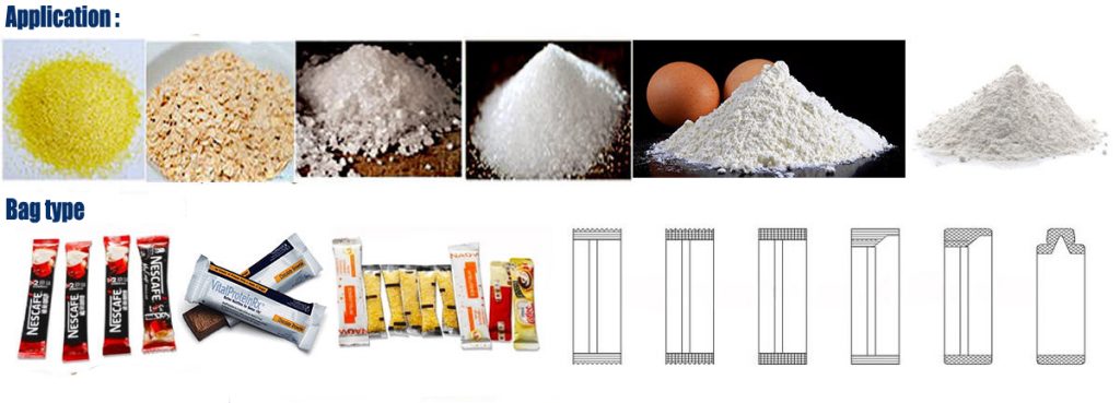 Ezt a gépet elsősorban a por termékek csomagolására használják: például tejpor, tejeszöldporpor, kávé por, fűszerek, currypor, fehérje por, fűszer, növényi por, vegyi és orvosi por termékek.